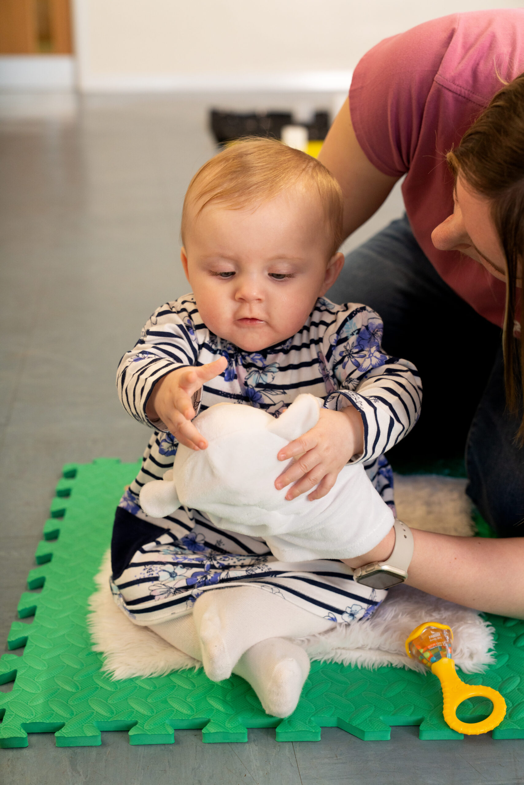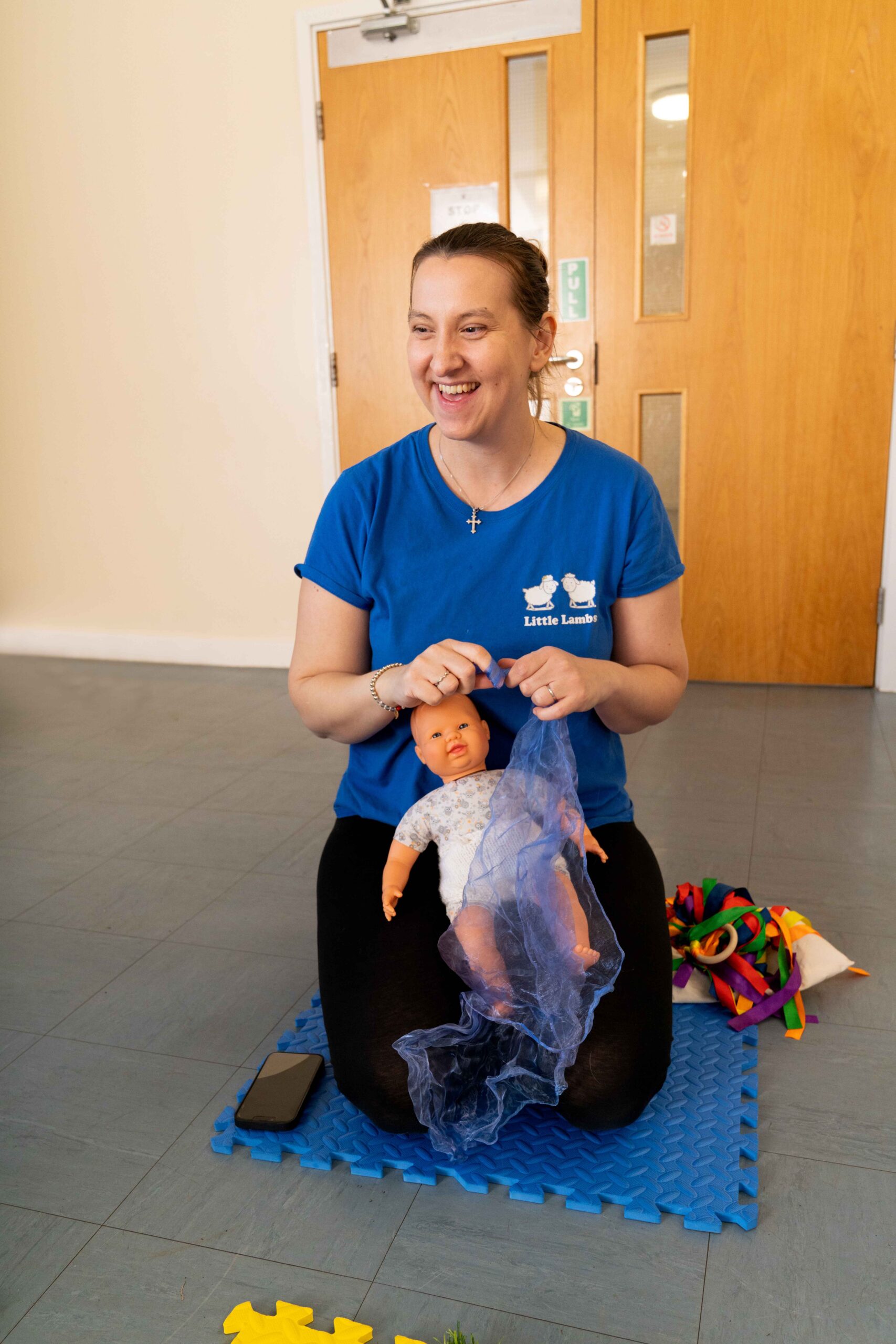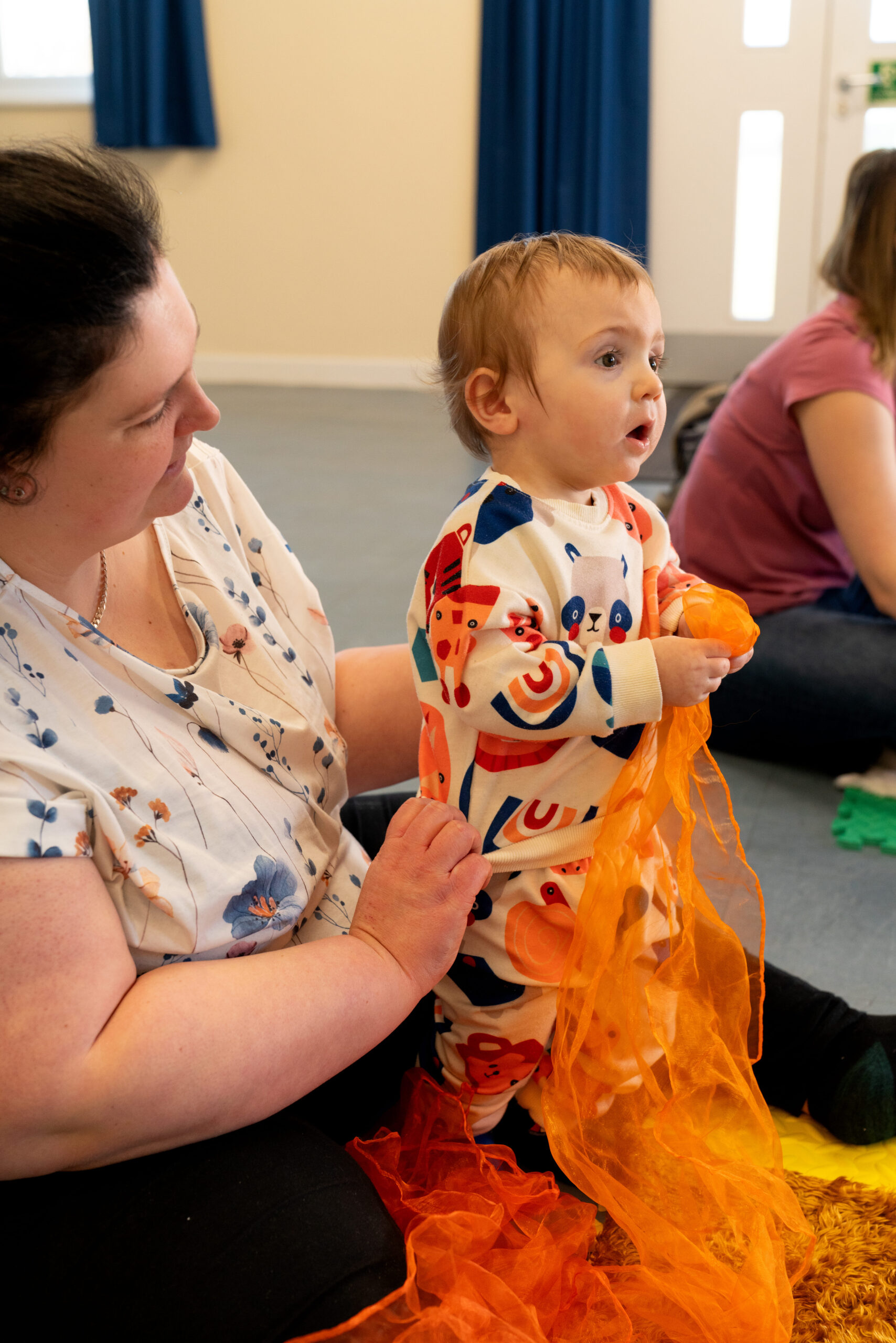 Each class begins with our signature Twirl Your Scarf Around song, sung to the tune of Wind the Bobbin Up. Our sessions include a mix of catchy songs, rhyme discovery, games, instrument exploration, and sensory experiences.
